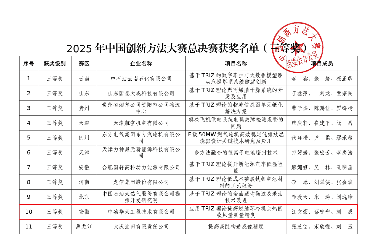 11月17日至21日,2025年中國創(chuàng)新方法大賽全國總決賽在山東泰安和濟(jì)南舉辦,中冶華天參賽作品《應(yīng)用TRIZ理論提高燒結(jié)環(huán)冷機(jī)余熱回收風(fēng)量測(cè)量精度》斬獲三等獎(jiǎng),充分展現(xiàn)了華天積淀深厚的創(chuàng)新底蘊(yùn)和華天員工昂揚(yáng)奮進(jìn)的創(chuàng)新風(fēng)采。